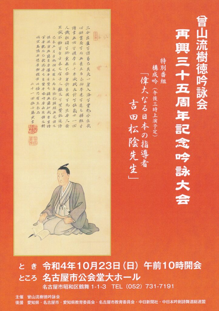 私達、曾山流樹徳吟詠会は、令和4年10月23日、名古屋市公会堂に於きまして、再興35周年記念吟詠大会を開催させていただきました。