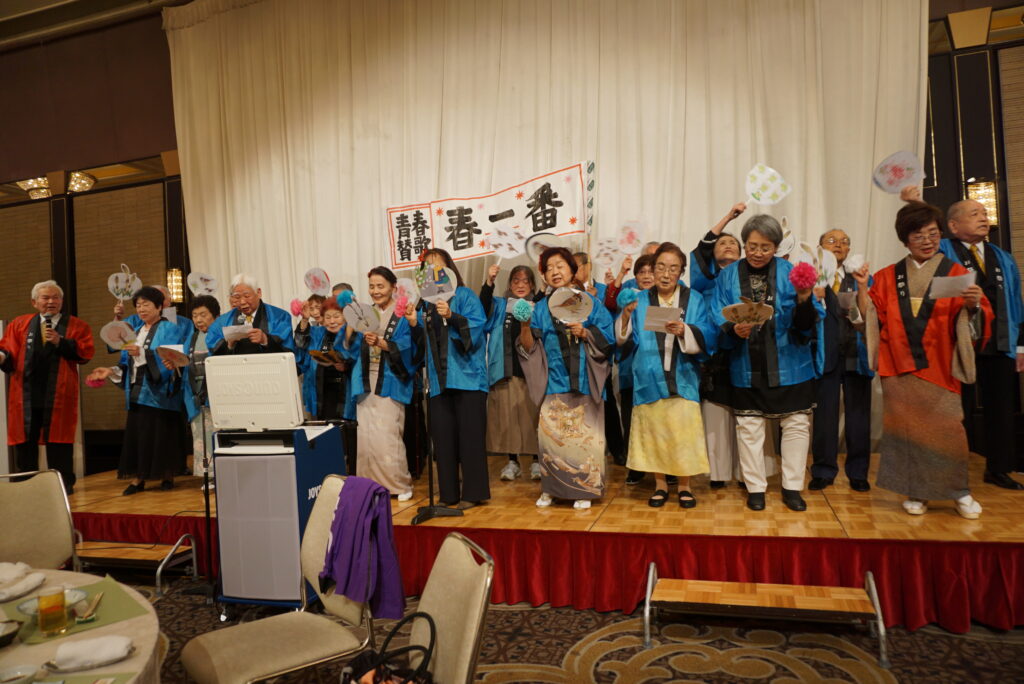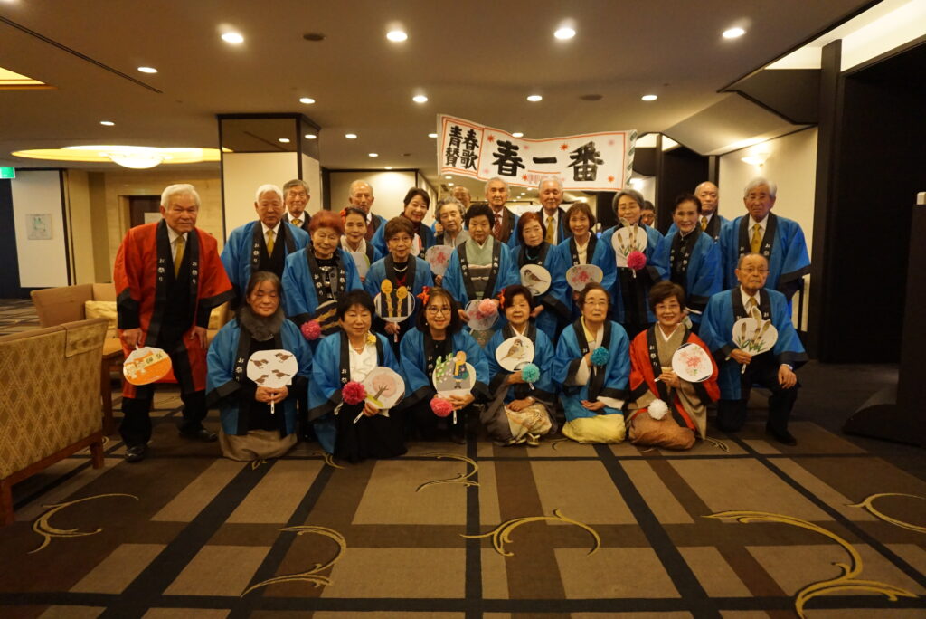 午前中は年頭のご挨拶、支部長辞令交付式などの式典及び新春構成吟『旭光の調べ』が開催されました。午後は祝賀パーティが開催されました。私たち柳青会は山田曾丹会長以下28名が参加し、午前中の新春構成吟への出演、午後のアトラクションでは全員でキャンデーズの「春一番」を替え歌入りで合唱し、大いに盛り上がり、楽しいひと時を過ごしました。