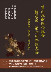 日時:平成30年10月7日(日)9時45分~場所:ウインクあいち 私達、曾山流樹徳吟詠会柳昌会本部は、平成30年10月7日、ウインクあいちに於きまして、第六回吟詠大会を開催させていただきました。当日は早朝より多数のお客様 […]