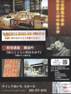 日時:令和5年11月5日(日)場所:ウインクあいち(入場無料) 私達、曾山流樹徳吟詠会山尚会は、令和5年11月5日、ウインクあいちに於きまして、第三回吟詠大会を開催いたしました。当日は、大勢のお客様にご来場いただきまして […]